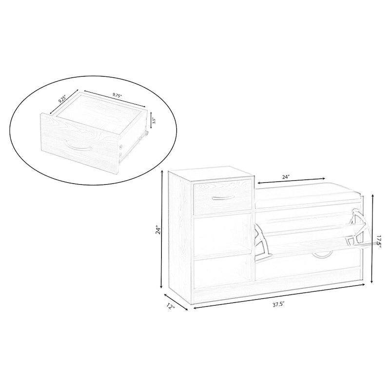 Welcome yourself home with our Wooden Entryway Shoe Storage Bench with Cushion. This shoe bench organizer has a hidden fold-out rack that stores up to nine pairs of adult shoes, plus two side open compartments and a drawer for extra storage. The shoe racks neatly fold closed leaving a sleek drawer exterior for display. The padded leather top serves as a comfy stool when you need a seat.