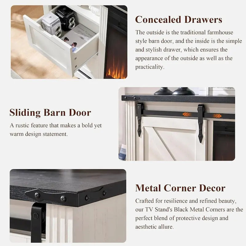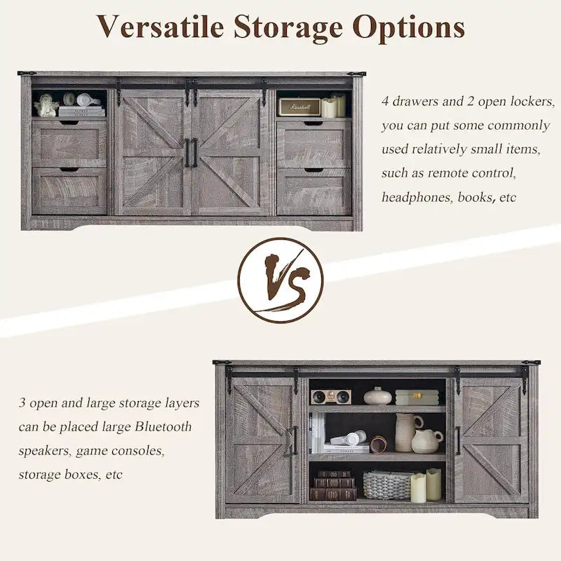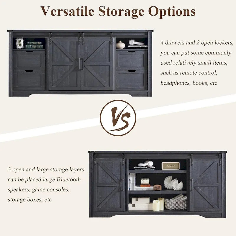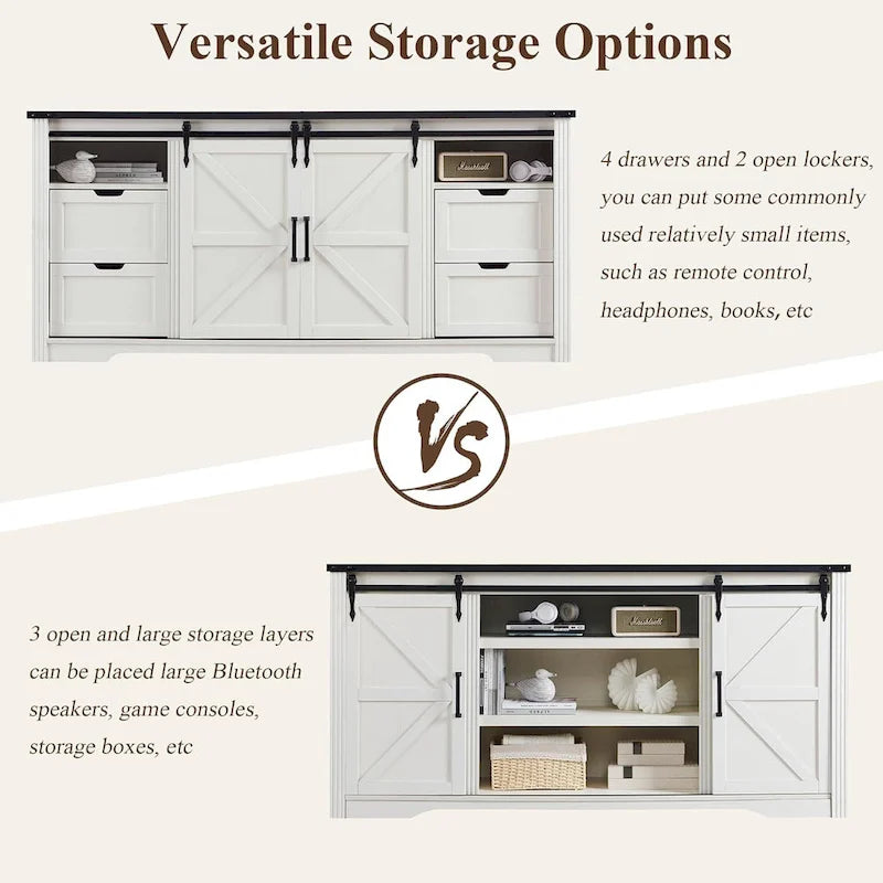 This farmhouse style TV stand showcases classic country style in its exterior design, perfectly blending rustic charm with modern elegance, and its simple yet elegant design makes it the highlight of any living room. The TV stand is made of high-quality engineered wood to ensure durability and long-lasting use. It comes with two unique sliding barn door storage cabinets, each with two drawers and a shelf, and three semi-open storage shelves in the center perfect for media equipment and art displays, providing ample storage space for organizing and displaying a variety of items. The metal corner setting combines aesthetics with protection for the cabinet corners. More than just a piece of furniture, this TV stand is a work of art that enhances your home decor and adds a touch of warmth and comfort to your living room.