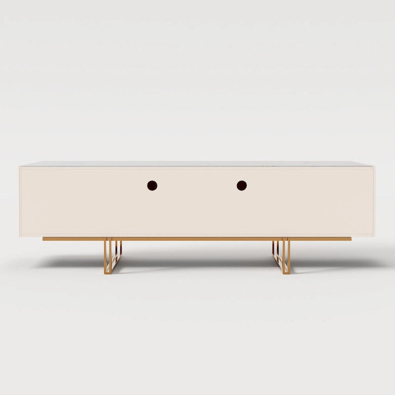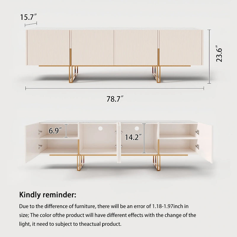 Elevate your home entertainment experience with our Modern Luxury TV Stand, an elegant Entertainment Center that combines style with functionality. This TV Console features a Faux Marble Top and Gold Stainless Steel Legs, offering a sleek and sophisticated look that enhances any room. The elongated media console provides ample storage with 4 spacious doors and 2 inner shelves, ensuring your entertainment essentials are neatly organized and easily accessible.