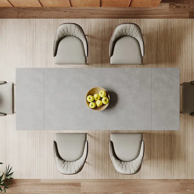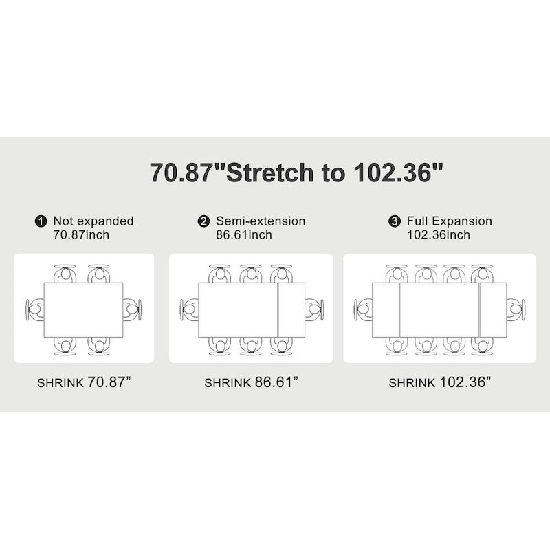 Telescoping Functionality: Enjoy the flexibility of our telescoping design, allowing you to easily adjust the table's length to accommodate varying dining needs. From intimate dinners to hosting larger gatherings, this feature adds versatility to your dining space.The overall length of the dining table ranges from 70.86 to 102.36 .