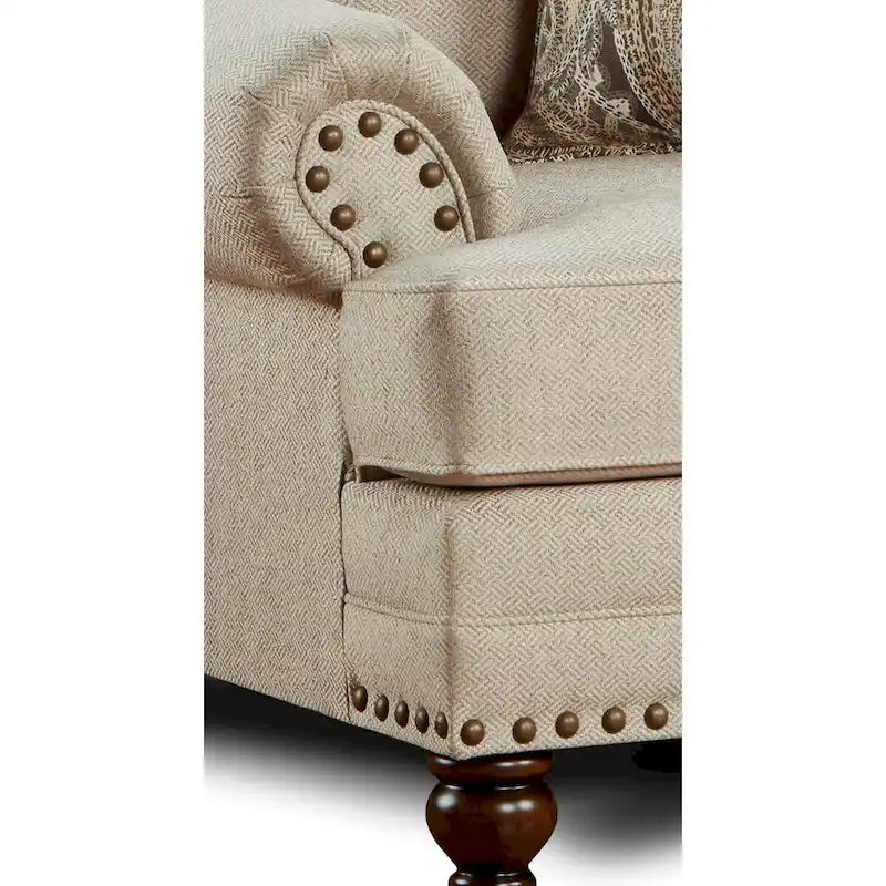 Sink into the comfortable and stylish Carys Doe Loveseat. This transitional loveseat features a kiln-dried hardwood frame filled with high-density foam and dacron polyester, ensuring lasting durability and comfort. The nailhead trim and rolled arms add a touch of sophistication, while the beige polyester upholstery complements any decor. With a 400-pound weight capacity, this loveseat seats up to 2 people and comes with coordinating throw pillows.