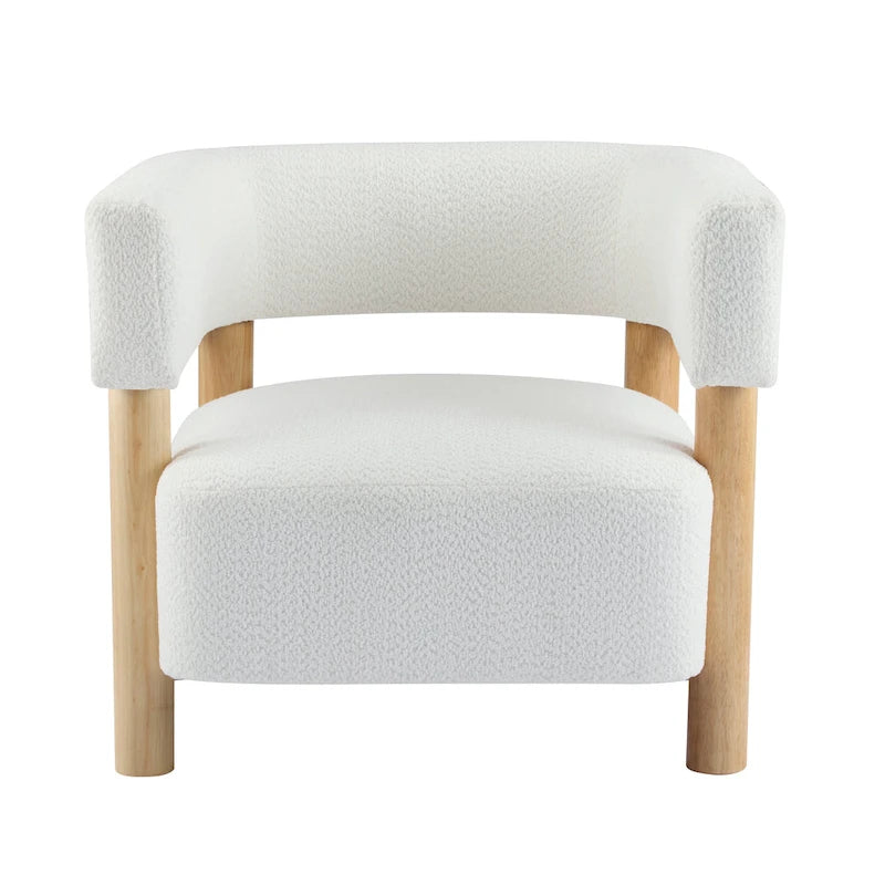 Sturdy Rubber Wood Construction: The boucle accent chair is built with a solid rubber wood frame and four thick cylindrical legs, ensuring exceptional stability and longevity. The natural wood elements add an organic, warm aesthetic while maintaining structural strength for daily use. The legs are designed to provide a balanced and secure foundation, blending functionality with modern design.