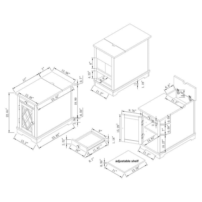 Experience the perfect blend of functionality and sophisticated style with our Classic Charging End Table. Meticulously crafted in a uniform color that exudes a composed and stately atmosphere, this end table serves as a focal point in any room. Its distinctive door design adds an artistic touch, while the integrated charge station, equipped with USB interfaces and a 60 cable, ensures your devices stay powered up and within reach. Keep your space organized with the spacious cabinet, ideal for tucking away items, and use the rear space for magazine storage. Enjoy the convenience of a smooth-gliding drawer and an adjustable shelf to accommodate your storage needs. Assembly is a breeze with the quick-install hinges provided, making it the perfect addition to your home or office.
