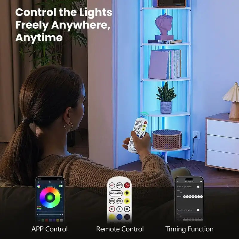 Versatile Corner Shelf with Light:Transform your space with our LED Corner Shelf,Whether used as a bookshelf, display shelf,storage shelf unit,or plant shelf,it seamlessly fits into your living room,bedroom,home office,or balcony.Its 90 right-angle design maximizes every inch,blending functionality with elegance.