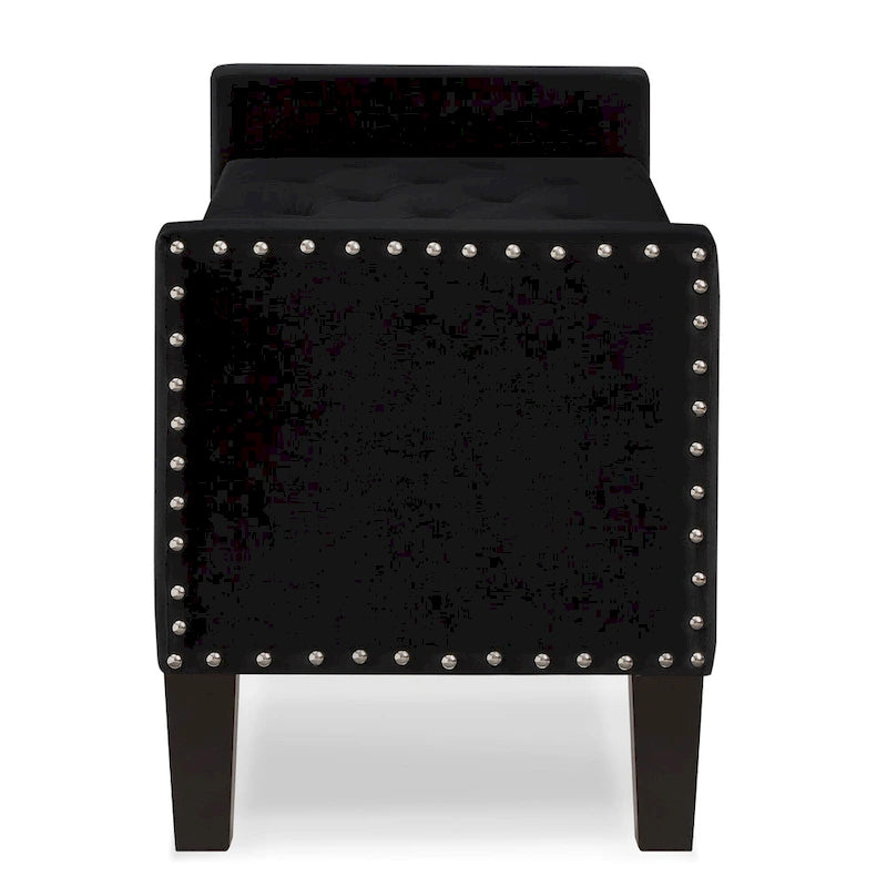- 1. Spice up your interior with this stylish arm bench,perfect for adding accenting detail to any bedroom, living room, or entry area. Covered in soft velvet fabric, this upholstered bench has dark wood finished legs and a plush foam-padded seating area.The straight line frame design is bookended by nailed trim sides,adding an elegant touch to this piece. Use it to enhance the decor of any room of your home.