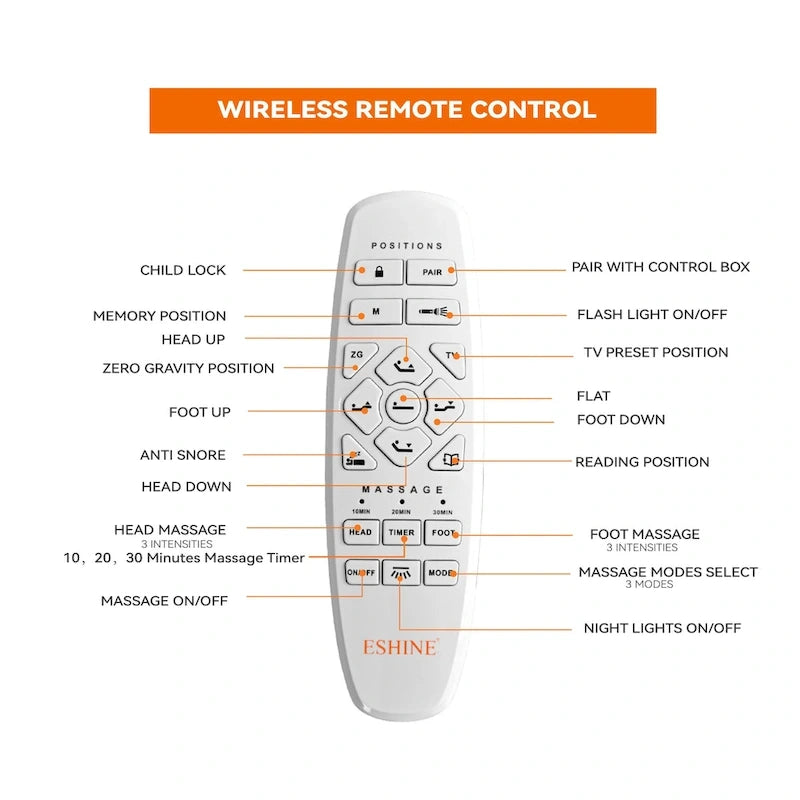 Wireless Remote Control & Easy to Install:Wireless remote in this adjustable smart bed having 19 buttons can meet all functional needs, such as watching TV position, massage, and anti-snore sleep. Easy Installation will be in 10 minutes and no tools are required.