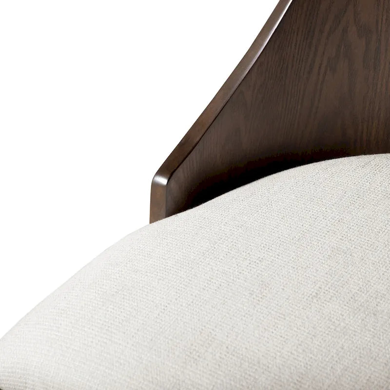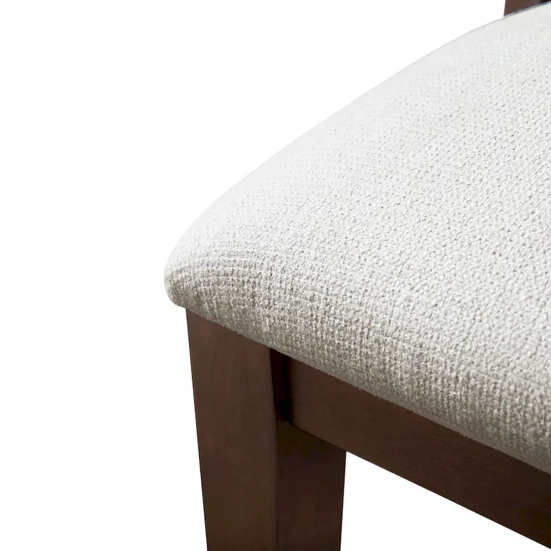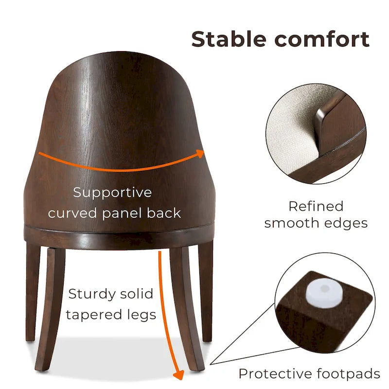Featuring a curved panel back and padded seat cushions, the side chairs provide ultimate comfort for long meals and gatherings. The stylish accent tapered legs and soft fabric upholstery in classic wood tone with white padding create a fusion of transitional and modern styles. These chairs are perfect for both everyday use and special occasions, enhancing the dining experience with comfort and elegance.