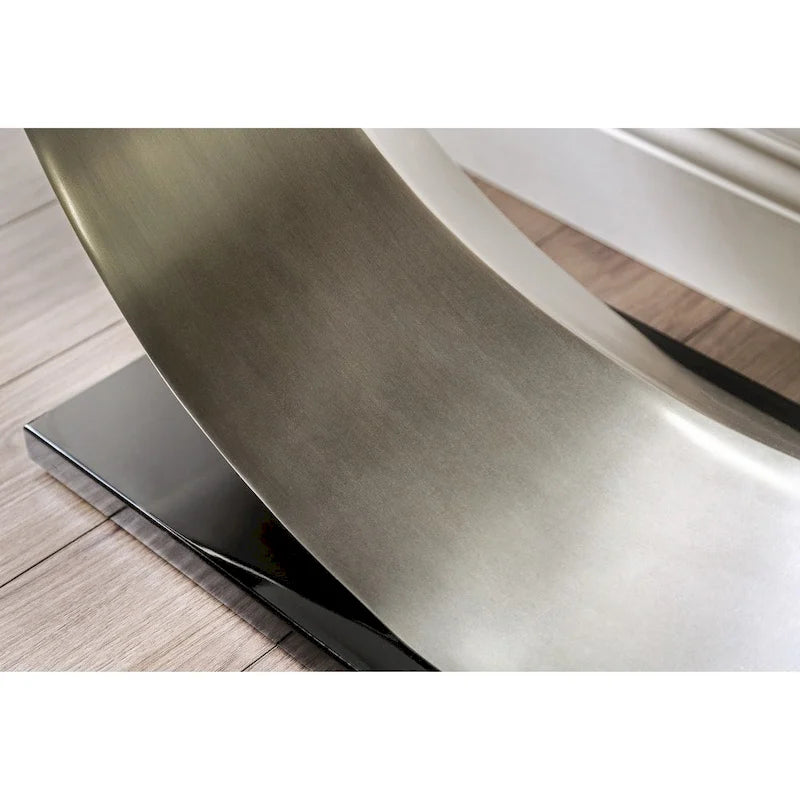 Gallery-inspired design melds sleek materials with a heady silhouette, producing an artisan two-piece accent table set fit for a custom contemporary space. The Heer silver two-piece table set from Furniture of America captures the spotlight as a focus element in a living room or family entertaining space. Embrace a blend of glass and metal with extraordinary shapes and finishes. Satin-plated metal delivers an Art Deco look in a table body with a U-shaped curving profile resting atop a tailored slab of glossy black finish metal, as gleaming sheets of clear tempered, beveled glass deliver tabletops showcasing a transparent look that adds an expanded view of its opulent design.