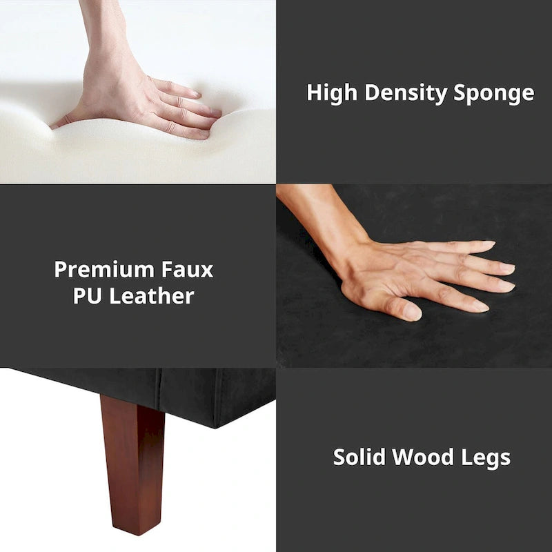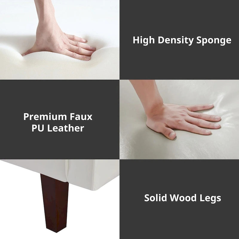 - Modern Mid-Century Tufted Futons Sofas : Our 3 seater futon sofa adapts a modern mid-century design concept,featuring skin frinedly faux leather upholstery,foam padded seat with serpent pattern spring filling,button tufted backrest,channel tufted cushion and solid wood legs for a very fashionable and contemporary look.