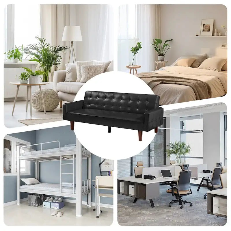 Our 74.4-inch tufted futon sofa is made from selected PU leather, which is very skin-friendly and delicate to the touch. It has a very comfortable ergonomic design with a medium height backrest and wide square armrests to provide you with good body support. Constructed with a solid eucalyptus wood frame, reinforced by 4 solid rubber wood legs and reinforced with a central rubber center. This modern mid-century futon sofa has a weight capacity of up to 600 pounds per sheet. This living room accent piece can be easily converted from a regular sofa to a futon bed thanks to the 3-angle adjustable backrest. Very practical for living rooms, bedrooms, offices, guest rooms and other small and compact spaces.
