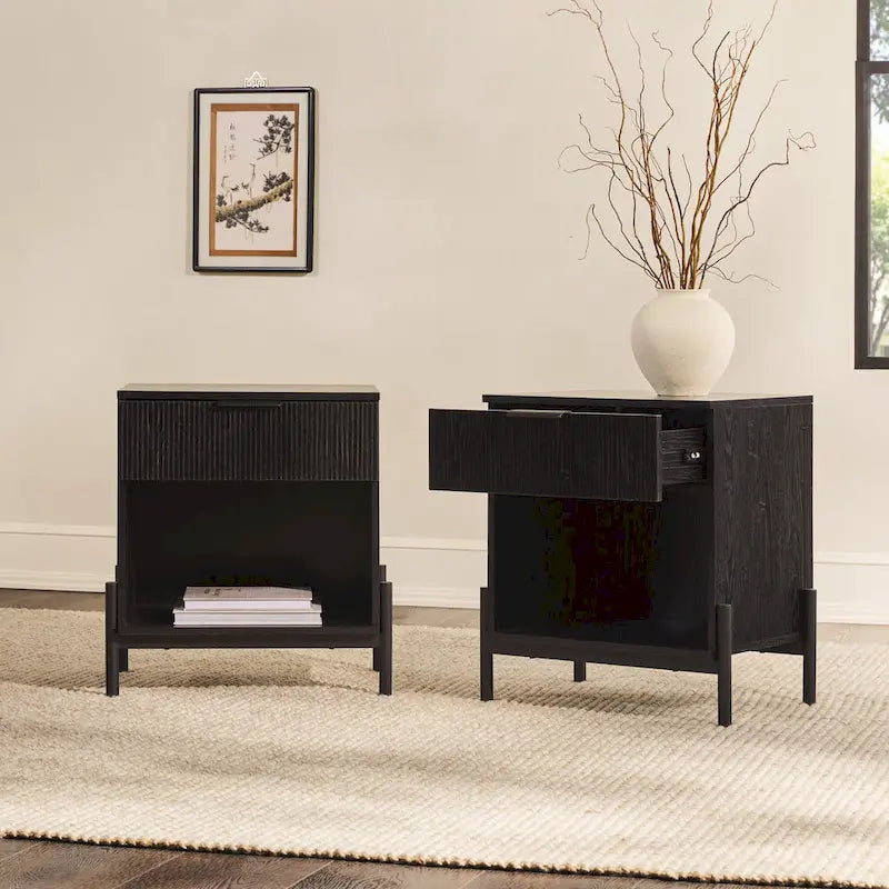 Practical yet soon to be the cutest pieces in your bedroom, these one-drawer nightstands have all the features you'd want in a modern bedside buddy. Their fluted drawer sets them apart from your other furniture, while their classic build and convenient storage lends a timeless look that'll fit right in. A single drawer on smooth glides and open cubby provide ample space for your novels, skincare, or electronic bedside must-haves, as well as dcor. Minimalist hardware and sleek metal legs relay a modern feel to a piece that you'll want to keep around for years of stylish storage. Whether they're paired with a matching bedside table as a duo in your bedroom, or displayed in your living room or home office, these pieces offer as much stunning form as they do durable functionality.