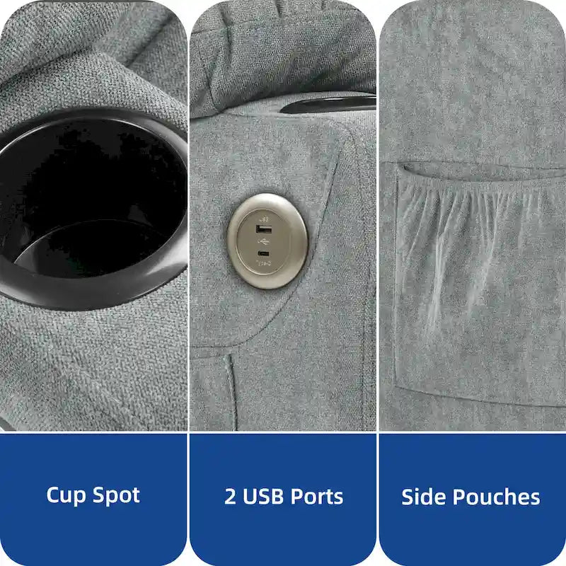 - Includes 2 USB outlets, 2 cup holders, 2 side pockets and 1 remote