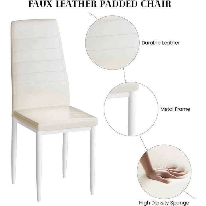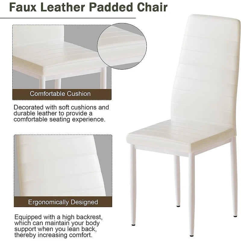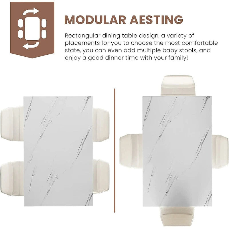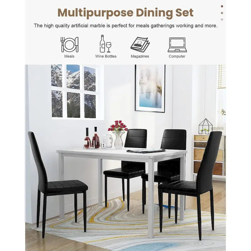 Upgrade your dining space with this stunning 5-piece kitchen table dining set featuring a marble look top and durable iron structure. The sleek black steel frame and glossy marble top offer a vintage look, while the four breathable PU leather chairs with thick padded cushions add comfort and glamour. Perfect for social gatherings, family meals, or a cozy breakfast, this set is a must-have for any home or coffee shop. With its modern design and built-to-last construction, this versatile set is an asset to any setting.