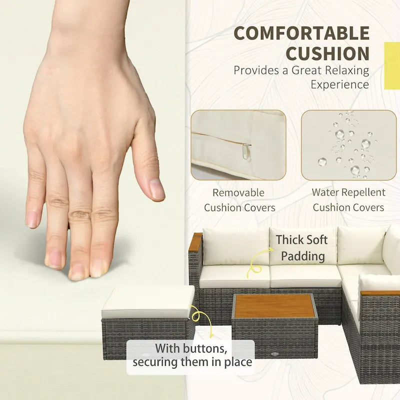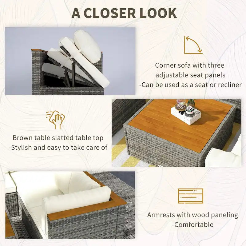 Descriptions:Transform your backyard into a haven of relaxation with the Outsunny 7-piece rattan sofa set! This versatile patio furniture set features a modular design, allowing you to mix and match for the great outdoor sectional sofa arrangement. Adjust the corner seats to your preferred comfort level and bask in the luxury of acacia wood accents, all while lounging on plush, easily maintained cushions. Elevate your outdoor patio furniture experience with style and flexibility.