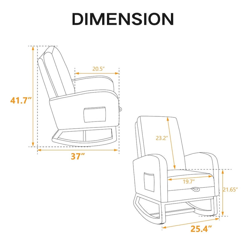 Fabulous Comfort:Covered with high-quality boucle for a soft and breathable surface, the rocking chair brings you a luxurious yet casual sitting. A refined curved wing back provides a comfortable sitting position for you to enjoy a leisurely time.Gentle Rocking:The rocking chair has excellent curved legs , making it rock gently and smoothly. Such a sweet design is the perfect centerpiece for the nursery and leisure, enjoying your time.Retractable Footrest:Our nursery rocking chair has a retractable footstool under the seat.This glider chair with an adjustable footrest is perfect for enhancing the aesthetics of your home while offering a comfortable spot to relax.Side Pockets:This rocking chair has side pockets for items like unfinished books and remote controls. Make it more practical for you to useSturdy and stable:The frame is made of sturdy plywood and rubber wood legs, which is super strong and durable. In addition, there is an extra fixed wooden cross bar between the two legs for better stability. Its max capacity can reach 250LBS.Easy to install:This chair only needs to be installed on the backrest and feet, and it only takes an adult to install it in 10 minutes, which is very time-saving.