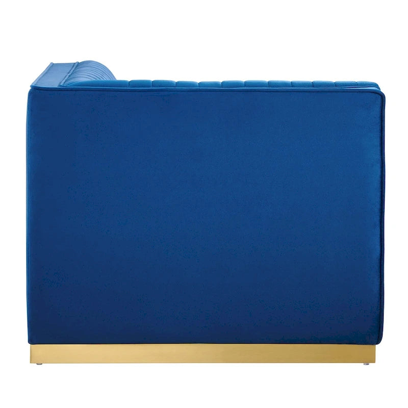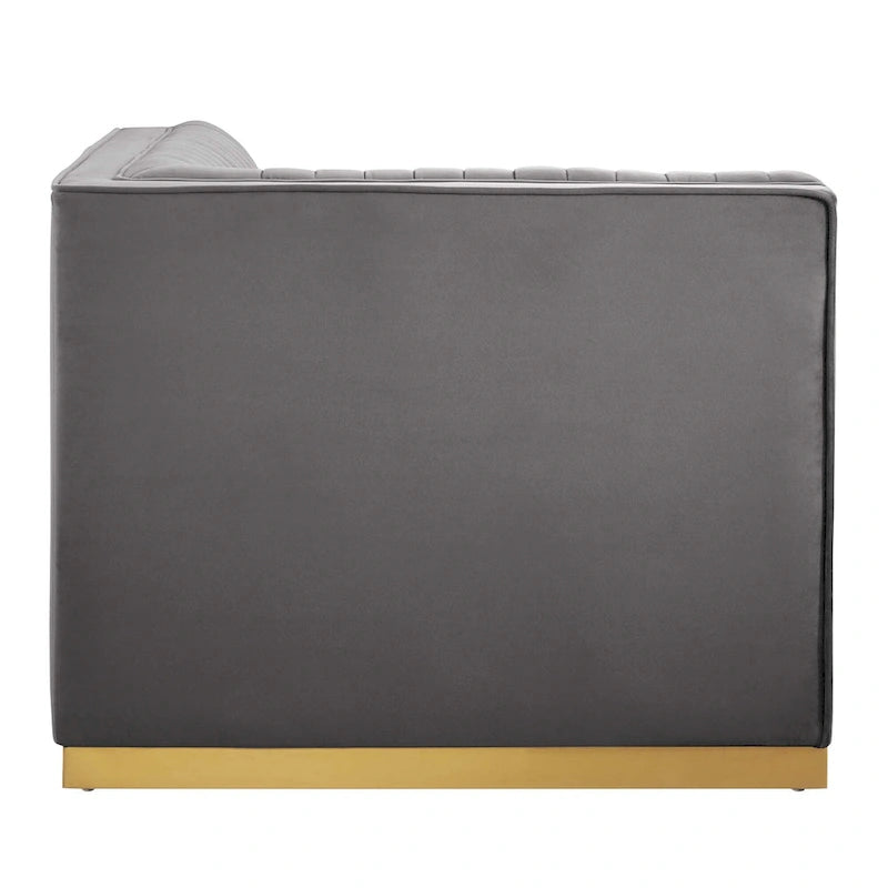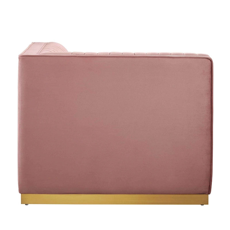 Glamour radiates from the organic linear design of the Sanguine Channel Tufted Performance Velvet Modular Sectional Sofa Left Corner Chair. Relax and follow the vertical channel tufting for a streamlined look that adds retro modern glamour to your living room, lounge, or home office. Soft, stain-resistant performance velvet upholstery creates a luxurious tactile experience while dense foam padding and an individually wrapped spring coil system provide ultimate comfort and support for this sectional sofa piece. Solidly constructed from eucalyptus wood and plywood, this sectional sofa collection is an eye-catching addition. Sanguine's palatial accents and premium comfort rest securely on a gold stainless steel base that complements any contemporary modern home or apartment. Includes non-marking foot pads to protect flooring. Weight Capacity: 330 lbs.