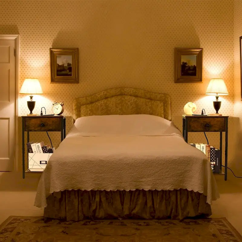 - 2-Tier Nightstands with DrawerNightstand with 1 wooden drawer and 1 open display storage shelf offer you ample space for storage. It is not only a rechargeable nightstand but also can be used as an end table, telephone table, etc. great for living room bedroom home dorm office, and small spaces; putting it beside the bed, next to the recliner, or in the hallway.
