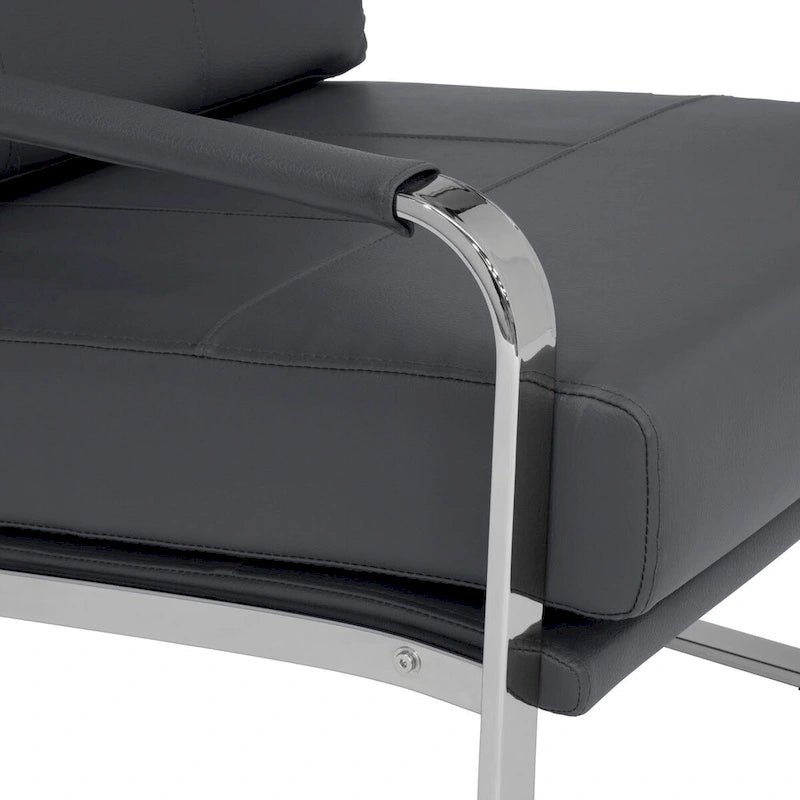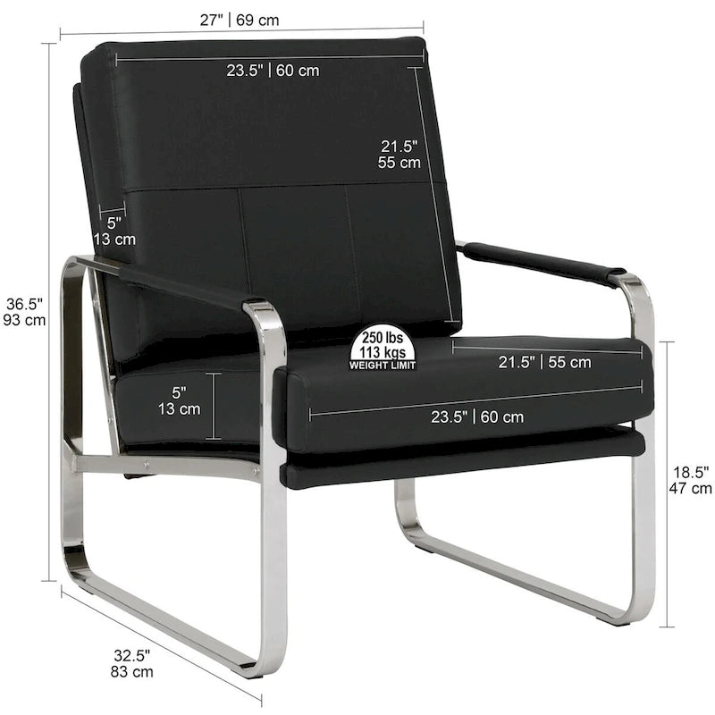 The stylish design of the Allure Arm Chair by Studio Designs Home is paired with durable materials to create a comfortable seating option for your living room or office. This accent chair features a 5-inch thick seat and back cushion and padded armrests for lounging comfortably. The seat is slanted to provide a reclined position for relaxing. The curved legs and arms add modern flair with a sleek chrome finish. Matching ottoman sold separately.