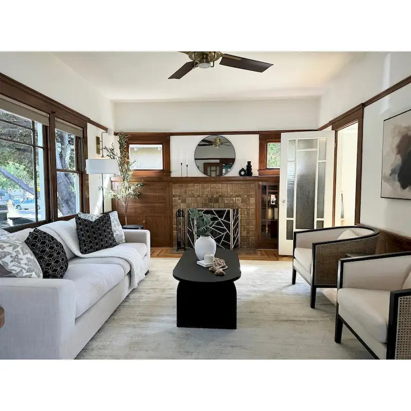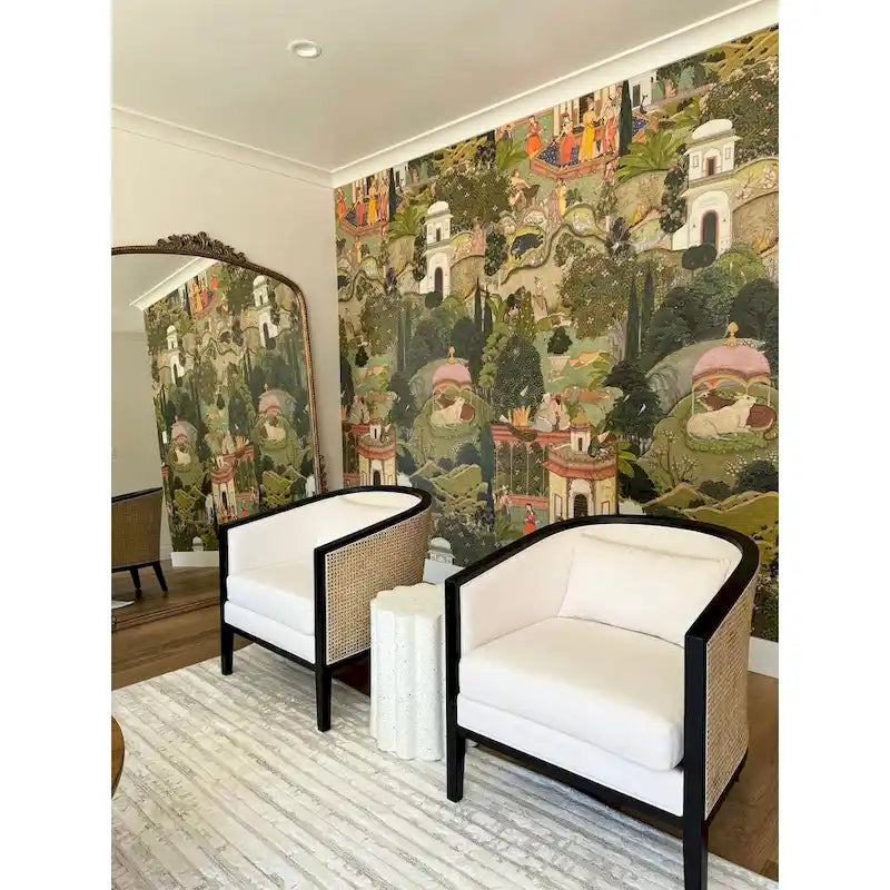 Natural Elegance with Tillman Arm Chair Collection - in barrel-back profile embellished with rattan frame, the deep-seating is also spacious and comfortable. Beautiful contrast of black frame and rattan are utilized to amplify the sophisticated design. Fully Assembled.