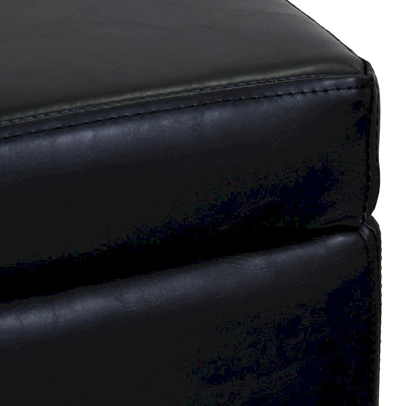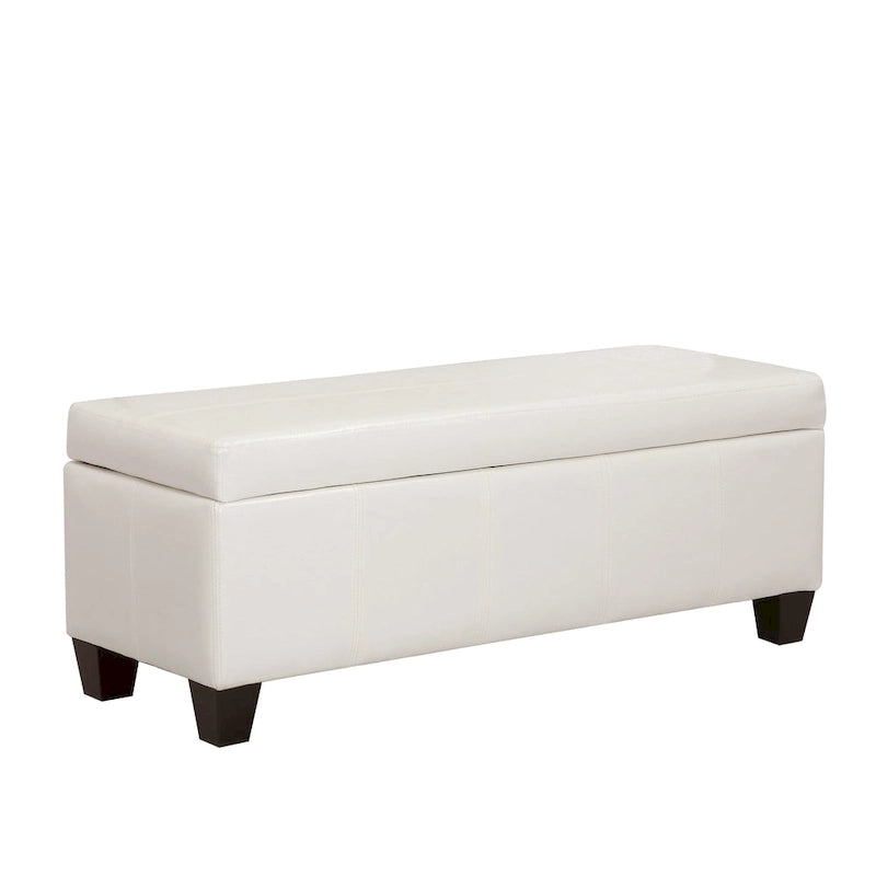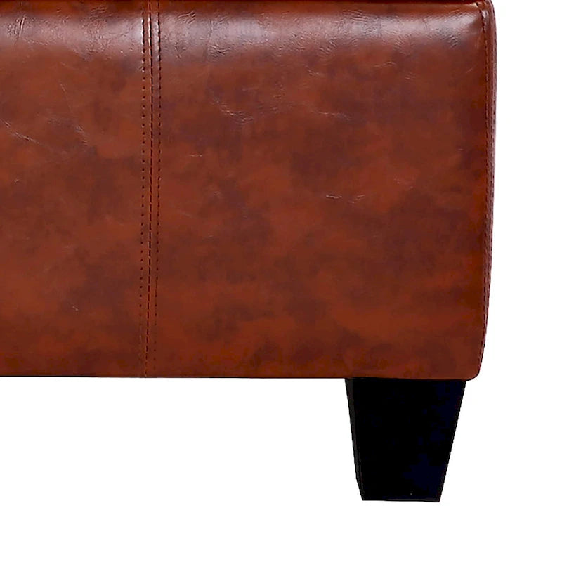 Add extra seating and storage to your living room with this upholstered ottoman bench. The durable wood frame and biscuit-tufted faux leather upholstery top keep the padded filling in place, while wooden legs add support. Store throws and extra pillows out of sight in the spacious interior, which features a built-in lid with a safety hinge for easy access.